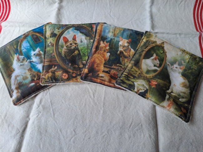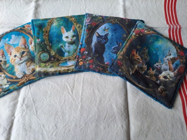 Portraits de chats en médaillons bleus. Eponge de bambou assortie.