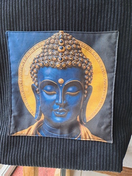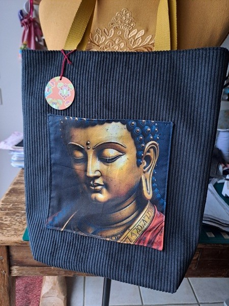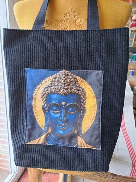 Totebag, sac à courses, sac de bibliothèque ou sac à ouvrages, sac pour poussette en velours côtelé noir, poche imprimée au recto "Bouddha bleu" et poche intérieure.