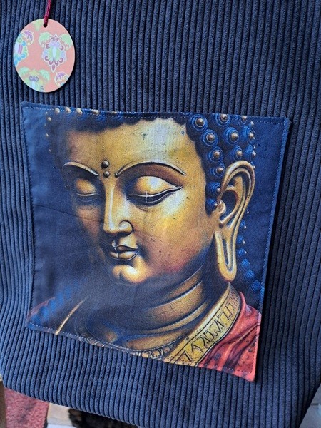 Totebag, sac à courses, sac de bibliothèque ou sac à ouvrages, sac pour poussette en velours côtelé anthracite, poche imprimée au recto "Bouddha tunique rouge" et poche intérieure.
