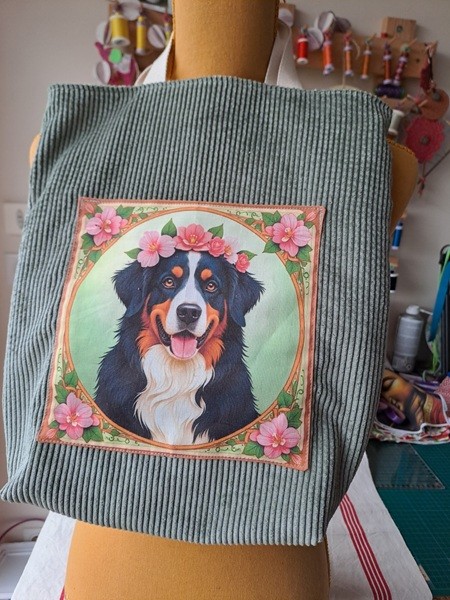 Totebag, sac à courses, sac de bibliothèque ou sac à ouvrages, sac pour poussette en velours côtelé amande, poche imprimée au recto "Bouvier bernois fleuri" et poche intérieure.