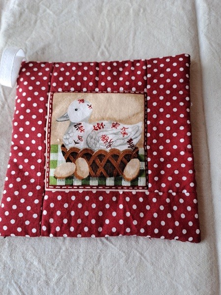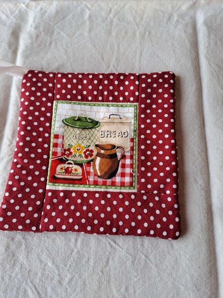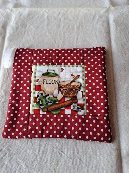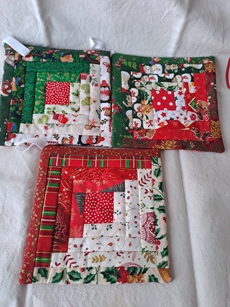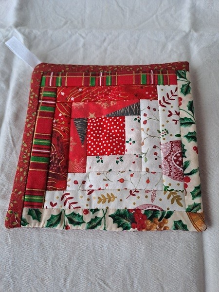 Manique en patchwork, motif de logcabin (cabane de rondins). Tons de Noël.