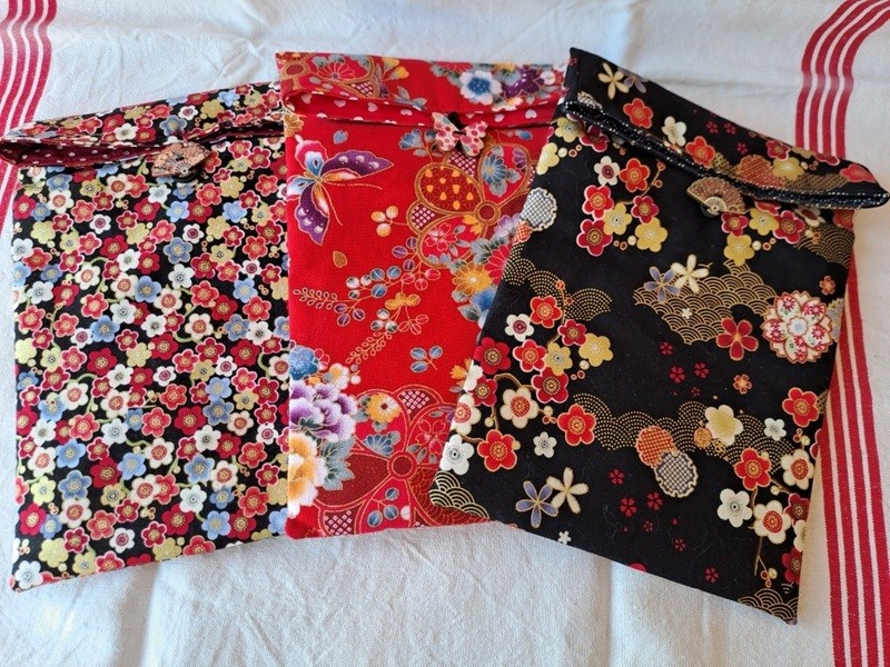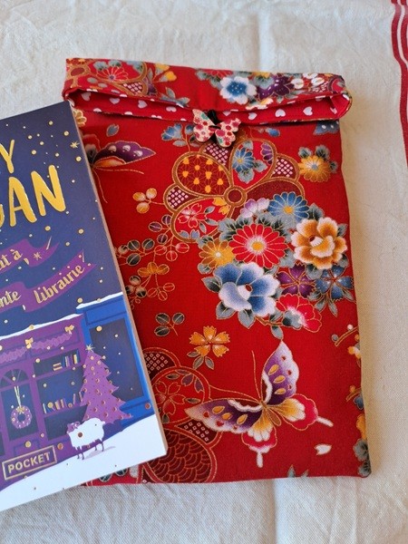 Protégez votre livre dans votre sac avec cette poche à livre "Fleurs et papillons", fond rouge, en coton molletonné, refermable par un bouton en bois, doublure assortie.
