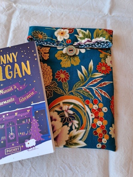 Protégez votre livre dans votre sac avec cette poche à livre "Pivoines", fond bleu canard, en coton molletonné, refermable par un bouton en bois, doublure assortie.