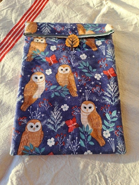 Protégez votre livre dans votre sac avec cette poche à livre "Chouettes", fond bleu, en coton molletonné, refermable par un bouton en bois, doublure assortie.