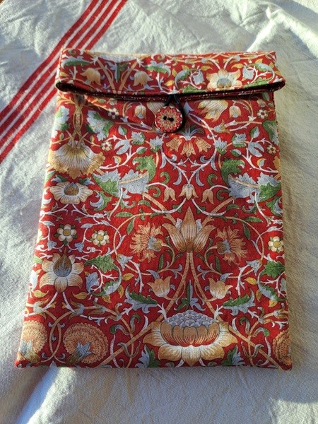 Protégez votre livre dans votre sac avec cette poche à livre "Arabesques florales", fond rouge, en coton molletonné, refermable par un bouton en bois, doublure assortie.