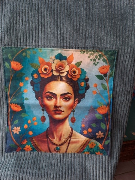 Totebag, sac à courses, sac de bibliothèque ou sac à ouvrages, sac pour poussette en velours côtelé bleu aile de geai et rouille, poche imprimée au recto "Jeune Mexicaine couronnée" à la façon de Frida Kahlo et poche intérieure.