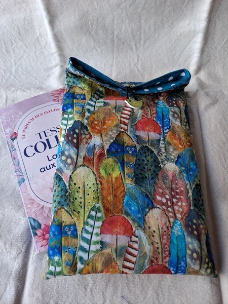 Protégez votre livre dans votre sac avec cette poche à livre "Plumes en couleur" multicolore, en coton molletonné, refermable par un bouton en bois, doublure assortie.