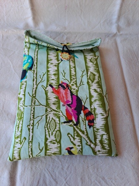 Protégez votre livre dans votre sac avec cette poche à livre "Raton-laveur" dans les arbres sur fond céladon, en coton molletonné, refermable par un bouton en bois, doublure assortie.