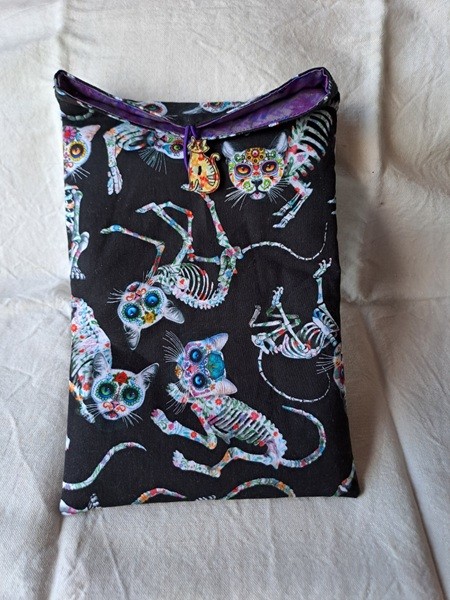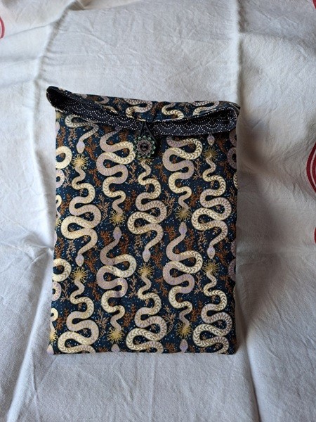 Protégez votre livre dans votre sac avec cette poche à livre "Serpents" fond noir et or, en coton molletonné, refermable par un bouton en bois, doublure assortie.